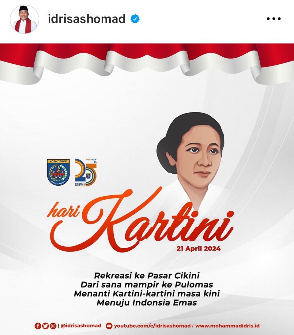 Melalui media sosial Instagram @idrisashomad, Kyai Idris, sapaan Wali Kota Depok, mengunggah ucapan Selamat Hari Kartini.